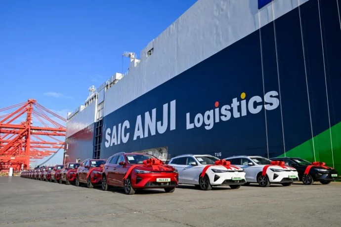 上汽集團(tuán)旗下9500車位遠(yuǎn)洋汽車運(yùn)輸船“安吉安盛”輪搭載著上汽自主品牌車型駛往歐洲