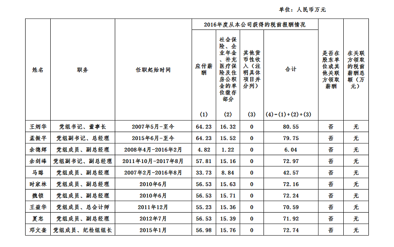 上表披露信息為我公司企業(yè)負責人2016年度全部應發(fā)稅前薪酬,按國家規(guī)定由單位繳存各種社會保險等,其中,第(1)項由國務院國資委核定。