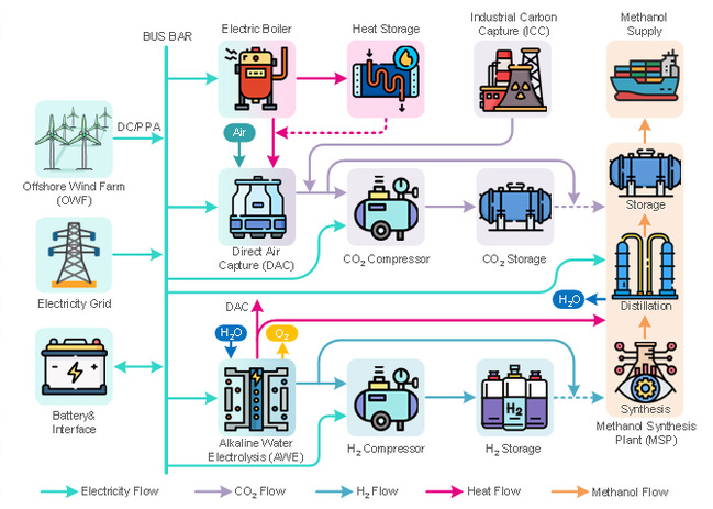為此,沈欣煒團(tuán)隊創(chuàng)新性地提出并優(yōu)化設(shè)計了在歐盟港口“海上風(fēng)電驅(qū)動綠色甲醇原位生產(chǎn)與加注”系統(tǒng)。該方案將海上風(fēng)電場、電解水制氫裝置、碳捕集技術(shù)以及甲醇合成裝置集成,實現(xiàn)從風(fēng)電到綠色甲醇的“一站式”生產(chǎn)與加注,有效避免了燃料運輸帶來的額外成本和排放,并滿足了歐盟對可再生非生物來源燃料全生命周期溫室氣體減排至少70%的嚴(yán)格要求。