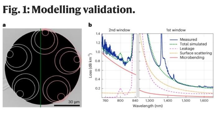 該論文介紹,用于通信的光纖通常為實心石英玻璃的設(shè)計,雖然經(jīng)過數(shù)十年的優(yōu)化,但信號損耗一直是個限制因素。因此,這種光纖在傳輸約20公里后會損耗約一半的光,這就要求經(jīng)常使用光纖放大器來增強長距離傳輸?shù)男盘,如洲際陸地或海底光纜。降低信號損耗程度能在狹窄波長范圍內(nèi)實現(xiàn),但會限制可傳輸?shù)臄?shù)據(jù)量,這在過去幾十年里一直阻礙著光通信的發(fā)展。