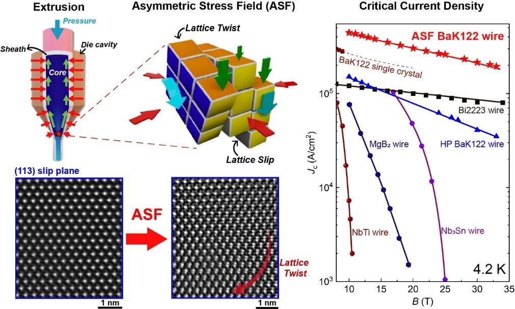 針對該難題,研究團隊創(chuàng)新提出“非對稱應力場”調(diào)控策略,采用規(guī);瘮D壓成形技術,協(xié)同調(diào)控靜水壓力與剪切應力,成功在脆性超導晶格中誘導出高密度、有序排列的位錯結構,形成高效磁通釘扎中心,顯著提升了材料在強磁場下的電流承載能力。