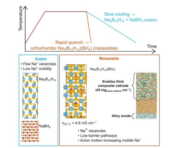 研究采用氫硼酸鈉材料,通過加熱再快速冷卻的成熟工藝,獲得了一種亞穩(wěn)態(tài)晶體結(jié)構(gòu)。該結(jié)構(gòu)具有較高的離子電導率,比文獻記載的數(shù)值提升了一個數(shù)量級。第一作者Sam Oh表示:“我們穩(wěn)定了一種從未被報道過的亞穩(wěn)態(tài)結(jié)構(gòu),其離子電導率比前體本身高出三到四個數(shù)量級!