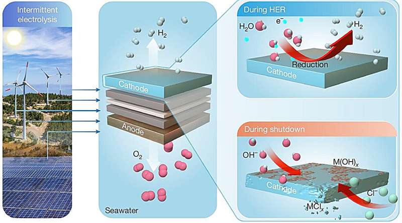 材料科學與工程系劉斌教授解釋,研究主要解決間歇性堿性(海)水電解過程中的氧化和性能損失問題,如反向電流、自氧化、自放電或氧氣交叉等,通過在電極上使用特殊保護層實現(xiàn)。