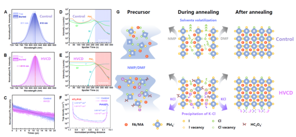 為解決這個問題,科研人員提出了一種能在垂直方向使氯元素均勻化分布的策略。他們在薄膜生長過程中引入堿金屬草酸鹽,利用其解離出的鉀離子與氯離子之間的強(qiáng)結(jié)合作用,有效抑制了氯離子的無序遷移,使其在鈣鈦礦層中均勻分布。