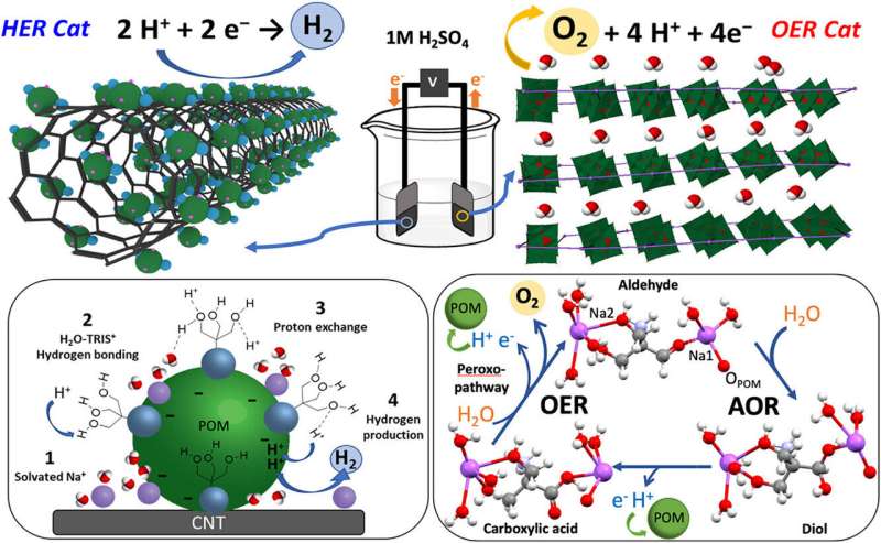 研究團隊將一種釩簇與碳納米管結(jié)合,形成混合材料。團隊負責(zé)人瑪麗亞·希門尼斯-洛佩茲指出:“關(guān)鍵不在于金屬簇本身,而在于其周圍有機陽離子的排列方式! 當(dāng)材料與納米管物理混合時,被稱為TRIS的陽離子被鎖定在晶體結(jié)構(gòu)中,促使反應(yīng)通過特定氧化機制產(chǎn)生氧氣。而當(dāng)材料以定向方式組裝時,同樣的陽離子被釋放并朝向表面,起到捕獲質(zhì)子的作用,從而使系統(tǒng)轉(zhuǎn)變?yōu)楦咝У漠a(chǎn)氫催化劑。